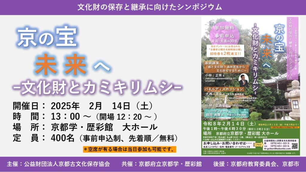 文化財保護を目的として活動する京都古文化保存協会では、カミキリムシ等の森林昆虫による被害や対策について文化財所有者や関係者と討論し、広く社会全体で文化財を未来へ受け継いでいく為にはどうすればよいかを発信するために、首題のシンポジウムを実施することと致しました。